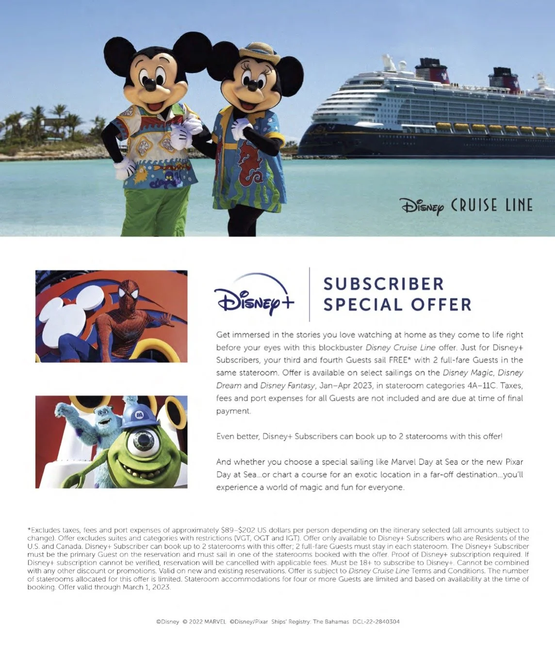 Disney+ subscribers can take advantage of the "Set Sail and Save!" promotion that allows their third and fourth guests to travel for free when sailing with two full-fare guests in the same stateroom on select sailings. From January through April 2023, this offer is only available on Disney Magic, Dream, and Fantasy ships with certain blackout dates - January 2, 2023 (Disney Magic and Dream) March 13, 2023 & 27th (Disney Magic), April 10th (Disney Dream) and March 11th & 25th (Disney Fantasy).